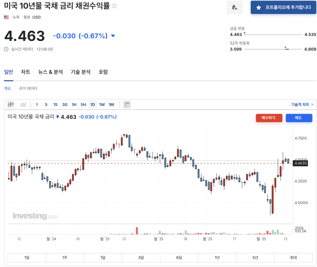 반대로 금리가 내려가면 어떻게 될까요? 돈을 빌리기 쉬워지니 자산 가격에 버블이 생기기 쉽습니다. 그런 경우에는 보통은 연준이 금리를 올리게 되겠지요. 트럼프는 미국 경제를 살리겠다며 관세정책을 통해 10년물 국채 금리를 낮추고 아울러 약 달러(환율하락)를 원하고 있습니다.